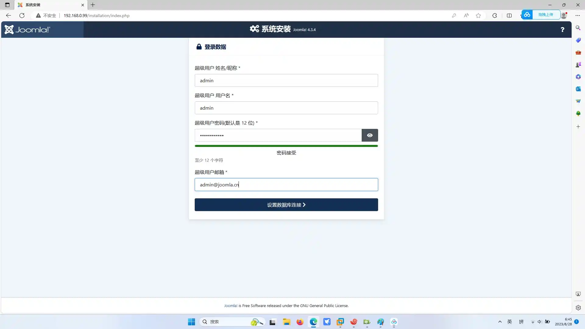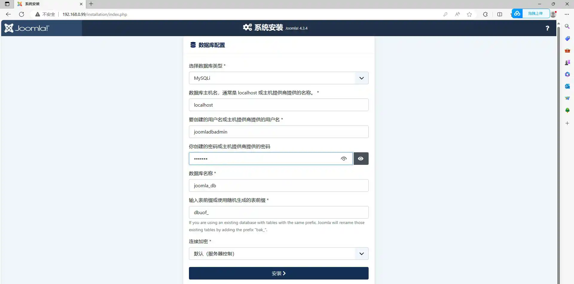 数据库类型保持MysqlLi,数据库主机名填写localhost或服务器IP地址,数据库名称、数据库管理员、管理员密码与之前我们在mariadb里边创建的数据库和用户信息保持一致,不然Joomla连接不上数据库就无法安装,表前缀保持默认,一般不需要改动,连接加密保持默认。然后点击安装,很快就会安装完毕。