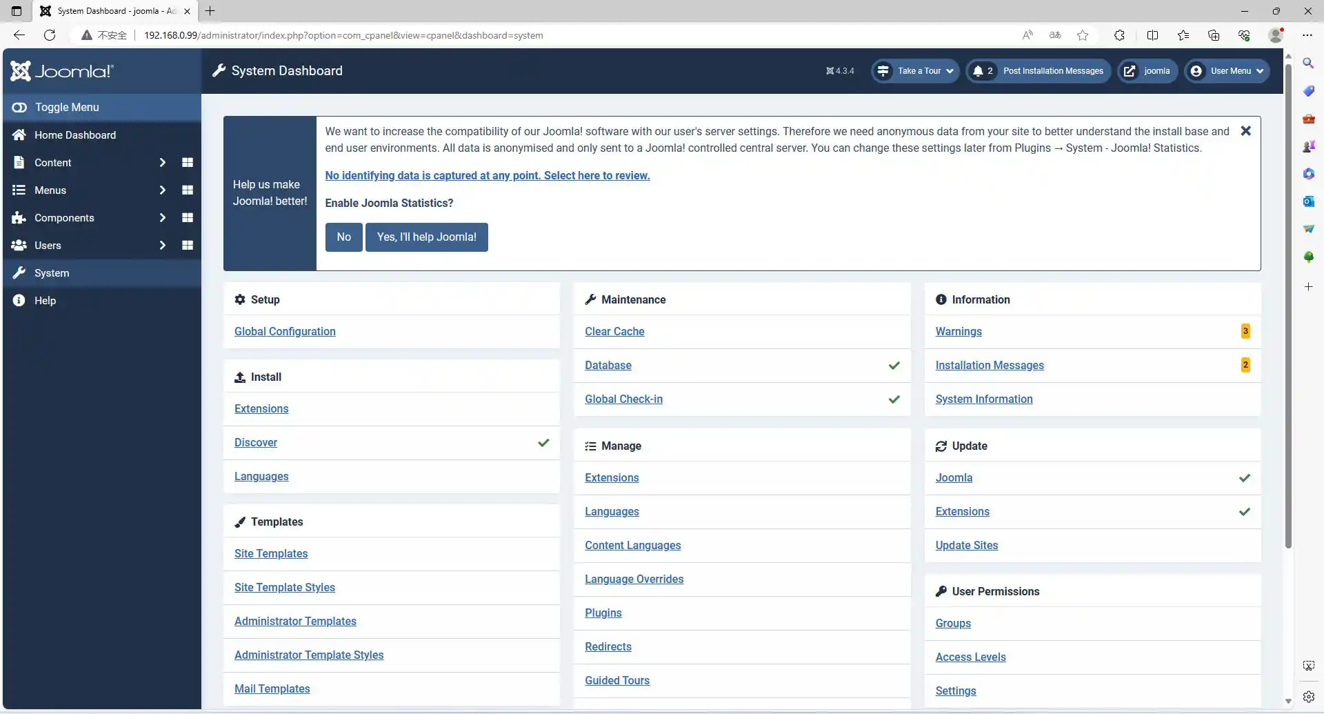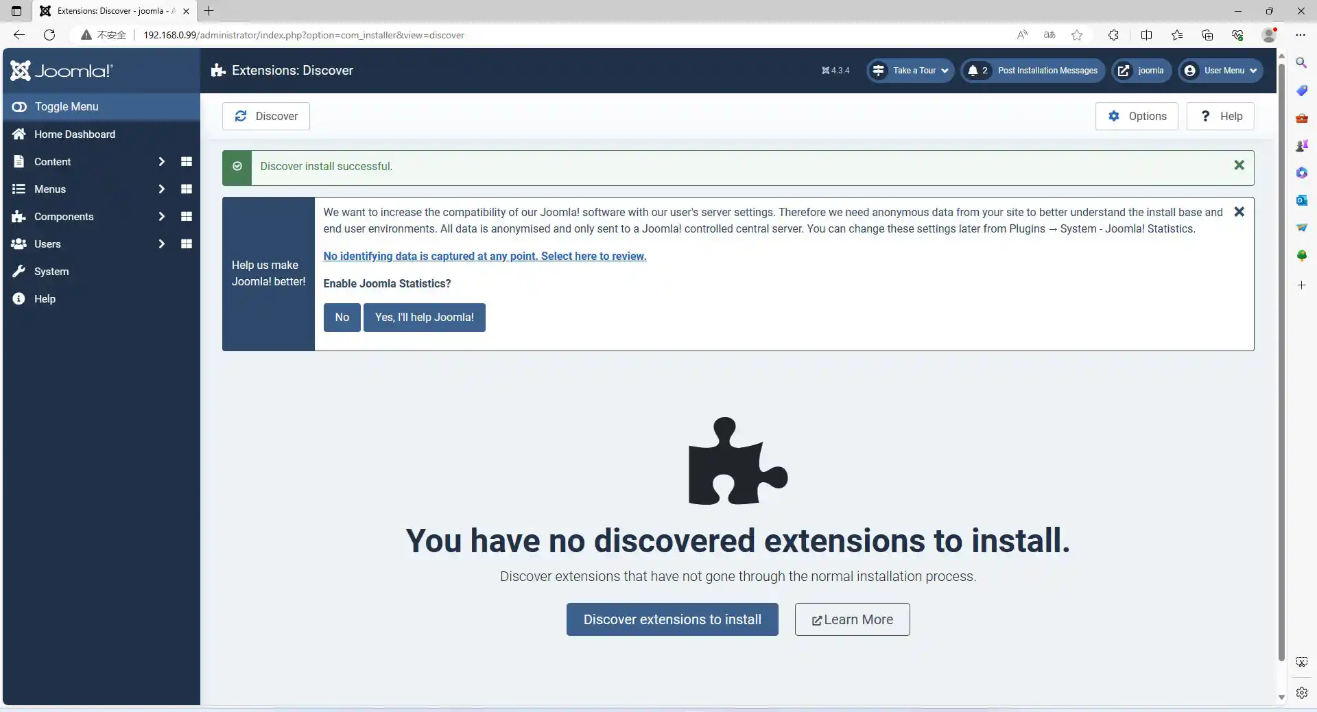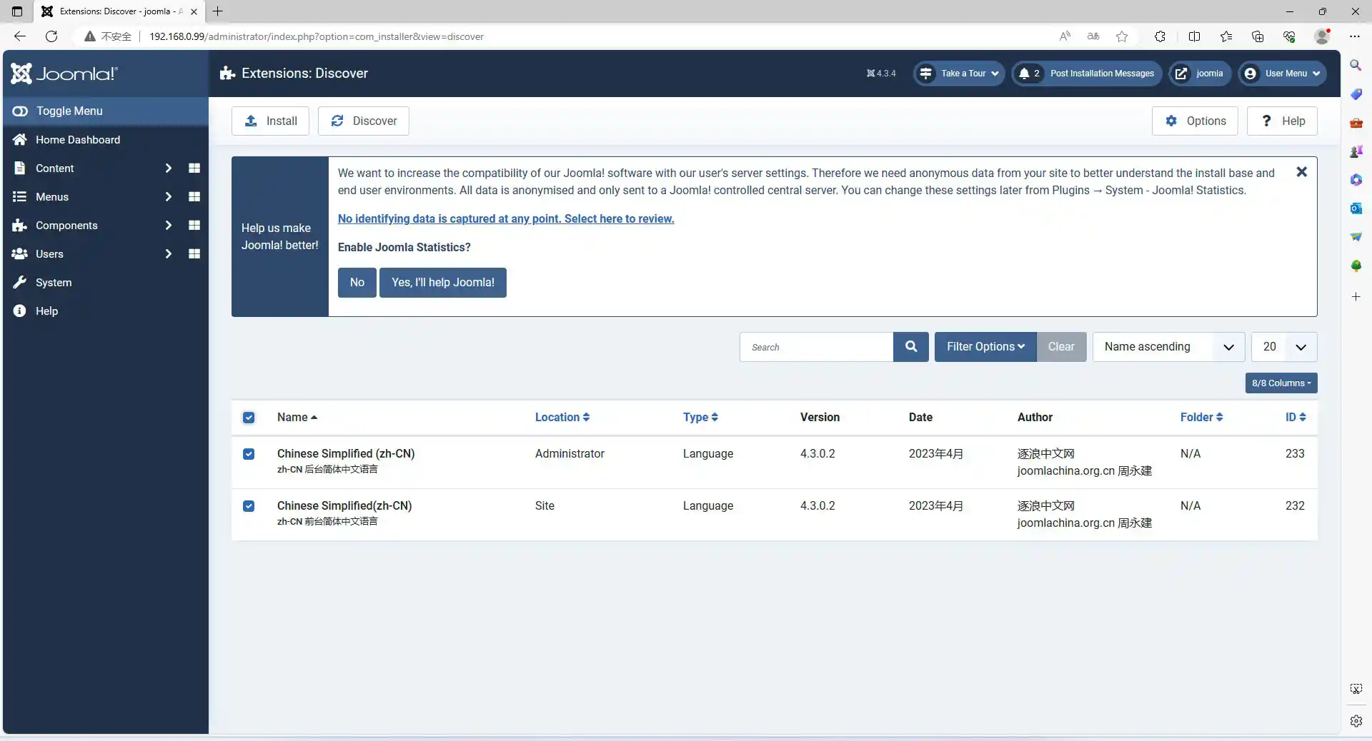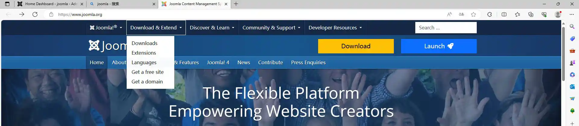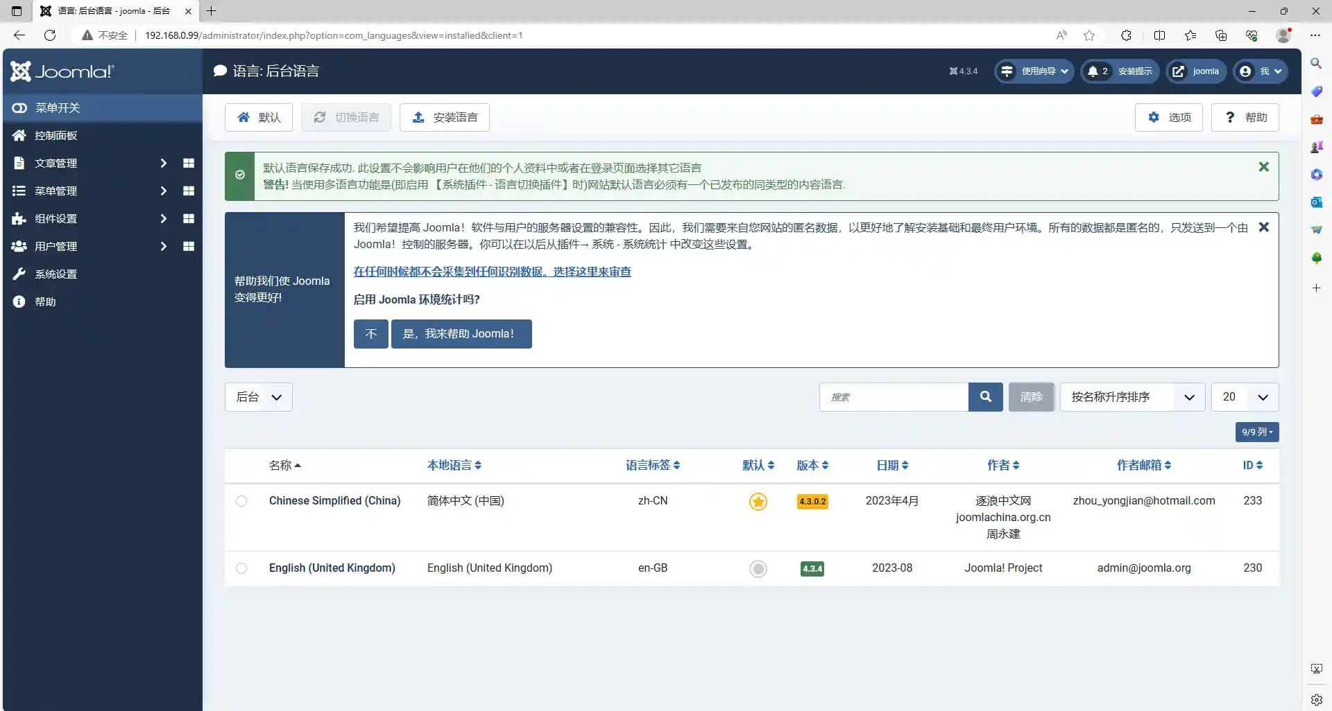 登录后台后第一步先安装中文语言包,去到Joomla官网下载中文语言包